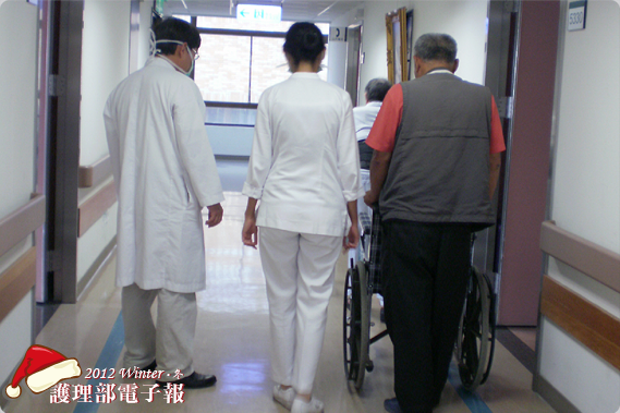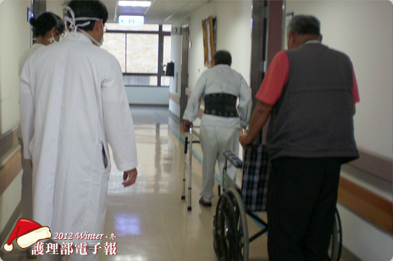 | 每天查房時,必定由醫師、護理人員陪同阿伯復健之路, 相信大家有共同的目標及信念,在不久的將來,一定可以達到目的地,加油喔! |