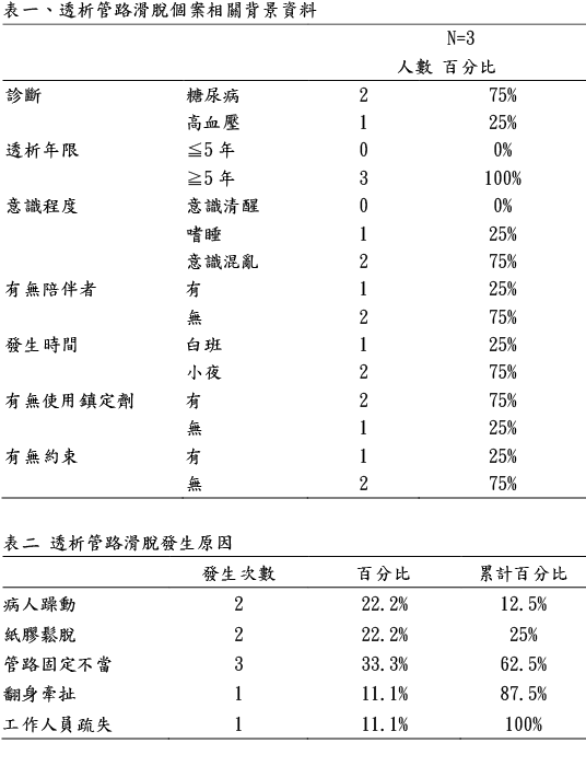 本研究為描述、回溯性調查研究設計,以實際訪查方式進行資料收集,主要資料來源為南部某醫學中心血液透析室,收案時間為自2009年至2010年,非計劃性透析管路滑脫病人的病歷,及透析管路滑脫事件提報資料庫等,找出非計劃性滑脫個案3名。本研究將以個數與百分比呈現,進行造成管路滑脫的危險因子分析。