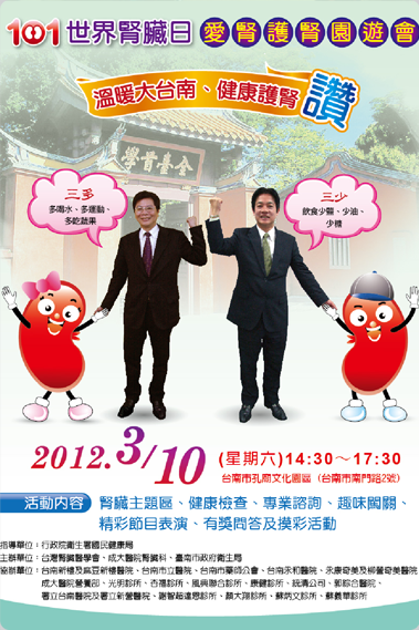 世界腎臟日於3月10日在台南市孔廟文化園區開跑啦!此次由台南市政府舉辦,三院區偕同参與愛腎護腎園遊會之活動。根據中央健保局門診透析統計指出,台灣地區尿毒症盛行率高居全球第一名,但是在各地區腎臟病健康促進機構所推動的照護活動下,尿毒症發生率已顯著趨緩中。慢性腎臟病是公共衛生議題之課題,腎臟病相關保健推展仍以醫療院所為主力,社區部份尚未普及推廣,則有賴於計劃之大型愛腎宣導活動以加強民眾對腎臟保健的認識,並重視早期檢測和預防一環,同時也需醫療團隊提供的完整照護,定期監測腎臟功能並減緩惡化,進而提升慢性腎臟病人之照護品質,亦可降低健保醫療負擔。