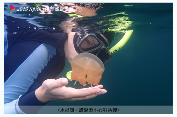 來到帛琉,最經典也最推薦的首要行程就是浮潛,隔天起了個大早,準備展開屬於我的海上冒險,套句魯夫所說『我不會去統治這片大海,在這片大海上,最自由的人-就是海賊王』,我就帶著這樣的氣勢,搭上了快艇,在遼闊海上,看著船長帥氣地操縱著,興奮之餘也多了一絲絲不安,因為碼頭離我越來越遠啦!不過內心的不安很快就被眼前的美景所取代,雖然雲量偏多,少了那麼一點海天一色的浪漫,卻依舊美的令人感動,也讓我更期待接下來的行程,首先來到『海豚灣』,ㄟˊ!千萬別誤會,這可不是偶像劇海豚灣戀人的拍攝點,帛琉的海豚灣,是由日本出資成立的海豚收容研究中心(據說是目前全世界最大的海豚研究中心),地點位於洛克群島內,成立的原因是為了要拯救遭日本漁民捕捉的11隻海豚,除了收容也訓練海豚們重新擁有回到海洋生存的能力,欣賞完可愛海豚的表演後,緊接著就是好戲登場,各式珊瑚保護區、山中湖(日軍沈船遺跡)、德國水道、大斷層、水母湖、美人魚水道、牛奶水域天然SPA、鯊魚城、干貝城……每個景點都讓人有說不出的驚艷,數不清的”餓”魚瘋狂搶食手上的麵包屑,連鯊魚都想來分一杯羹,透過蛙鏡及呼吸管,海底世界竟是這麼樣的安靜,沒有吵雜的塵囂,沒有嘰嘰喳喳的對話,只有自己緩慢吸吐的呼吸聲,看著小丑魚和海葵正兩小無猜的嬉鬧著,難得一見的蘇眉魚以霸王氣勢粉墨登場;各式軟硬珊瑚也不惶多讓,全拿出看家本領拼了命地展現美姿;『腦狀珊瑚』則正如其名,就像一顆顆的大腦紋路;大斷層的壯觀奇景,更讓我畢生難忘,雖是浮潛,看著斷層深不見底的黑,抓緊浮板的手不自覺地更用力了。
