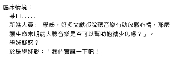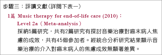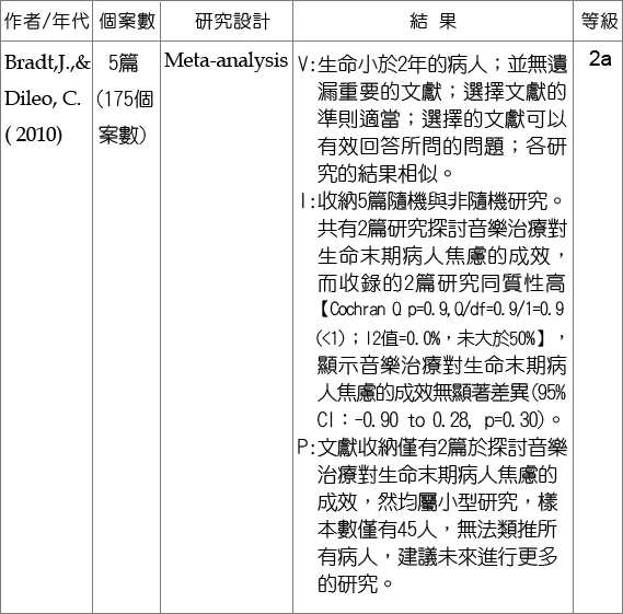 依Oxford(2009),此篇文章為Level 2a的Meta-analysis。文獻收納5篇研究,只有2篇研究有探討音樂治療對生命末期病人焦慮的成效,共有45個參加者。經統合分析研究結果顯示音樂治療的介入對生命末期的焦慮成效無顯著差異。臨床上我們亦提供6位生命末期病人音樂治療,發現病人聆聽音樂期間情緒較為平穩,然結束音樂治療後約15分鐘,病人將再度焦躁不安,也反映音樂治療對病人焦慮緩解持續時間較短!