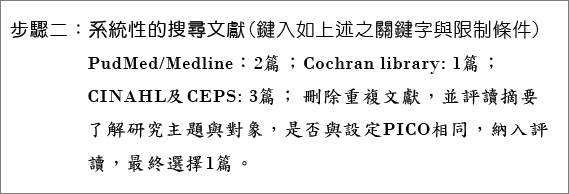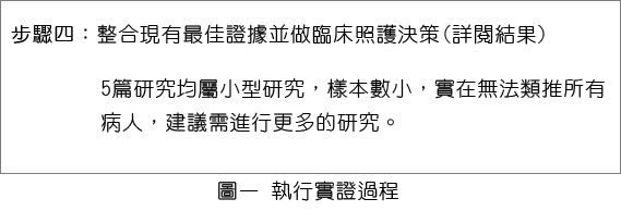 以實證方法進行文獻收集與評讀,使用Cochrance、NGC、TRIP及CEPS等資料庫,輸入關鍵字:Adult、patient、Rapid Response Team、Placebo、mortality、Cardiac arrest,共取得76篇相關文獻,再排除加護病房病人、重複性文獻及語言限制,篩選出4篇,經文章題目及摘要篩選,最終採納2篇,進行詳細評讀。實施實證方法的過程如圖一。