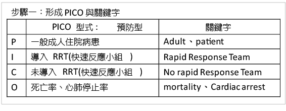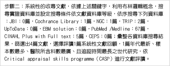 以實證方法進行文獻收集與評讀,使用Cochrance、NGC、TRIP及CEPS等資料庫,輸入關鍵字:Adult、patient、Rapid Response Team、Placebo、mortality、Cardiac arrest,共取得76篇相關文獻,再排除加護病房病人、重複性文獻及語言限制,篩選出4篇,經文章題目及摘要篩選,最終採納2篇,進行詳細評讀。實施實證方法的過程如圖一。