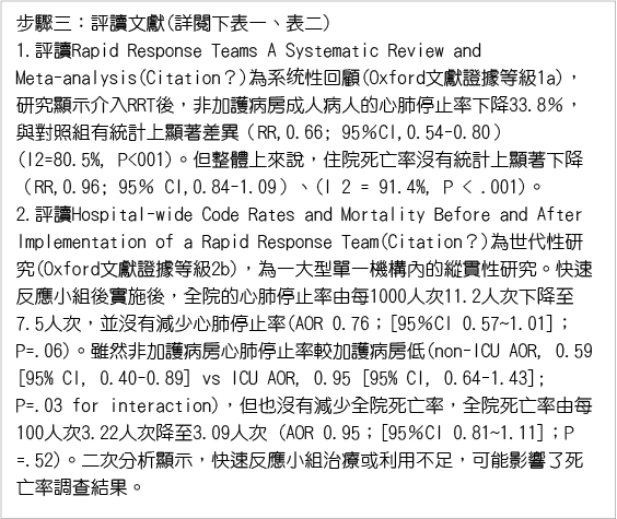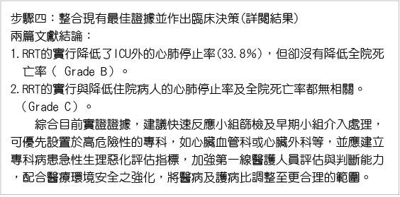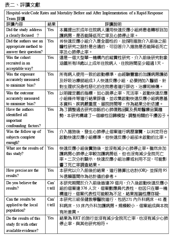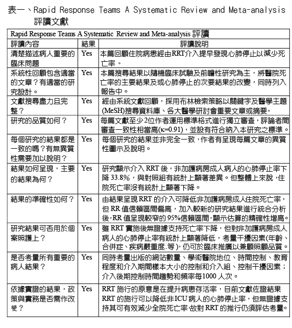 依Oxford文獻證據等級區分,此二篇文章別為系統性文獻回顧(1a)及世代性研究(2b),依Critical appraisal skills programme(CASP)進行文獻評讀。經整合文獻結果發現,無證據支持快速反應小組之介入可降低成人一般住院病患死亡率,但對降低心肺停止率可能有幫助。