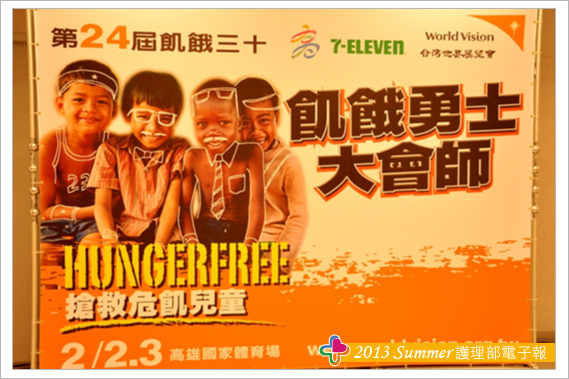 2013年2月2日是我們夫妻的結婚六周年紀念日,當時看到院內網站正在徵求第24屆飢餓30的醫療志工,心想飢餓30是什麼?以前都只有在電視報導聽過但沒有實際參與過,於是當天回家就興沖沖的跟我先生說今年的結婚紀念咱們就在飢餓中渡過吧!他當然頓時傻眼!