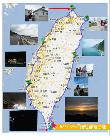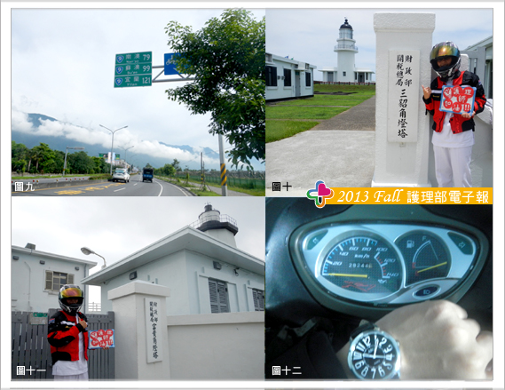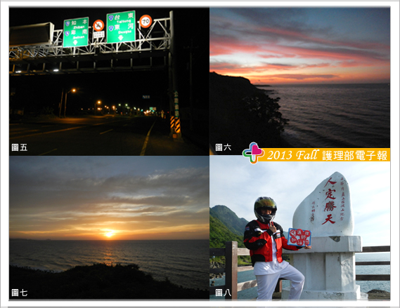 凌晨04:02,來到台9和台11的交界處,終於來到環島人生的交叉點,既然要環島,就環外圍吧(圖五)!凌晨04:30,在台東段台11跑著跑著,日出的彩霞毫不留情地出現(圖六)。05:47,太陽升起得很快(圖七),整條路都亮了,可怕的是…有上過大夜班都知道,這個時間會超級想睡覺!有好幾段路,我明顯感覺到我在〝度估〞!只好自己打氣:「加油!人定勝天(圖八)!」。早上08:44,進入蘇花公路(圖九)12:18 極東點—三貂角燈塔(圖十),下午14:43 極北點—富貴角燈塔(圖十一),終於…晚上21:57,回到台南市佳里區住家,里程數:28244 Km(圖十二),我終於完成我的夢想!
