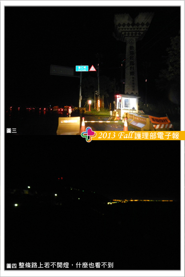 在豪雨的摧殘下,我決定先在墾丁的小七稍作休息,接著繼續沿著台26線出發。一路上連一台車、一個人,甚至一盞燈都沒有,感覺非常可怕,路兩旁都是樹叢,當下非常害怕有什麼東西會衝出來。凌晨00:53,終於到達台灣極南點─鵝鑾鼻燈塔,這裡真的需要很大的勇氣和夠亮的手電筒才敢走進去,伸手不見五指的暗,暗到超級可怕,這時候如果什麼東西出現都不奇怪,走在到燈塔的那段路,心中五味雜陳,但是為了達成24耐環島四極點的目標,我硬著頭皮架腳架、自拍。然而,真正可怕的在後頭,台26線→縣道200甲→縣道200→台26→縣道199甲→縣道199→台9,有走過這段路的同仁一定可以理解,這段路之所以可怕到是,整路沒路燈就算了,整條都是山路,還起霧下大雨,不時會出現右側是沙丘,也有整段路都是泥濘,左側一大堆落石。凌晨02:43結束這段可怕的路程,抵達台東縣達仁鄉(圖三),我終於接到台九,雖然也沒路燈,但至少是個有車輛的路段,半夜裡的台九,就是一堆砂石車伴你跑山路,因為颱風過後,所以路況也不是太好,整條路上若不開燈,就是像(圖四)這種景象,什麼也看不到的暗。