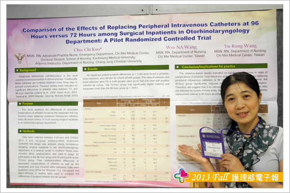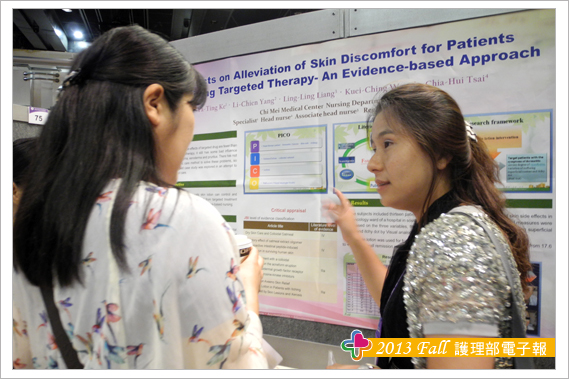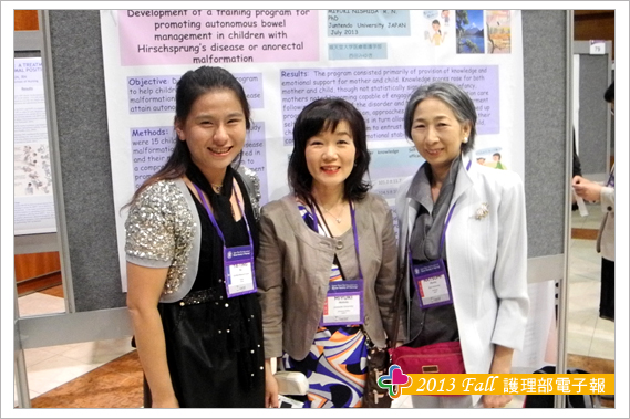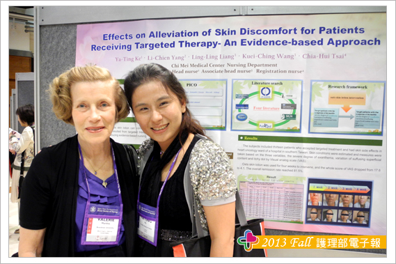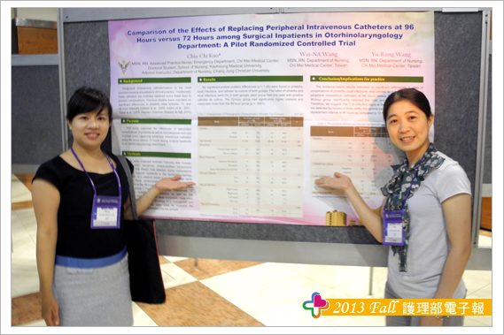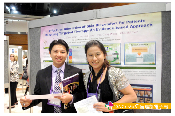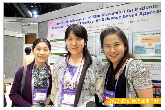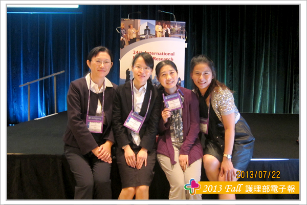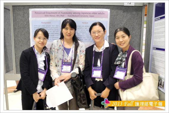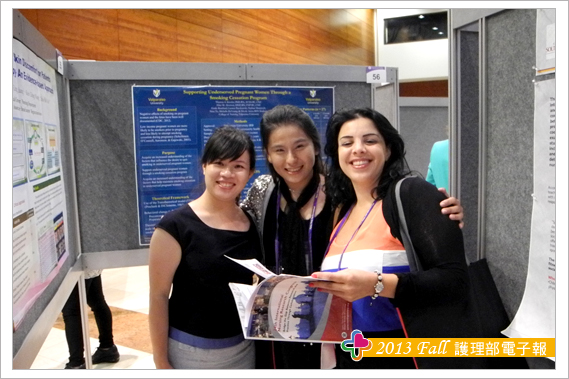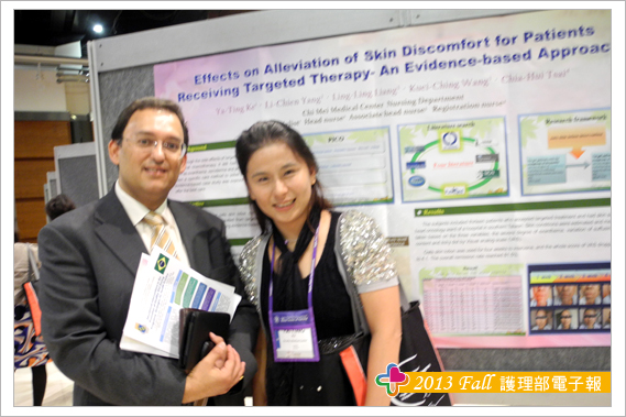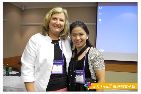 參加此次研討會另一大收穫為結交到世界各地的護理界專家與朋友,其中特別有幾位交流的學者與大家分享,海報看板的鄰居往往是交到朋友的第一步,由於張貼海報時總是需要朋友伸出援手,比如遞膠帶或協助黏貼海報,所以台灣護理人充分發揮熱情與互助合作的天性,總讓外國人印象深刻,加上海報簡介時,總有空檔聊上幾句,故與Theresa 教授與Trayer教授在短短的一天內很快熟絡起來,交流時發現肢體語言更能輔助不同國家間的語言落差,護理學者們均非常有耐心聆聽我們不甚流利的英文分享台灣奇美醫院護理實證與專案推動的成效。另外與日本、韓國、泰國等亞洲國家的臨床護理師與學校任教老師之間的交流也頗多。