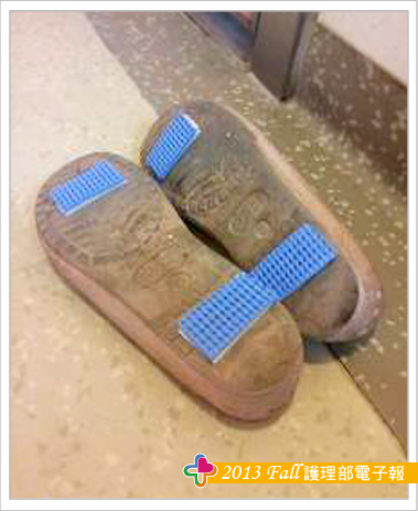 1. 首先將浴室防滑貼剪成適當大小,以不超過鞋寬為準,並在鞋子及浴室防滑貼背面各貼上魔鬼氈,即可貼在病患鞋底,如圖一: