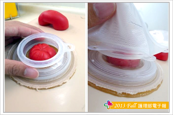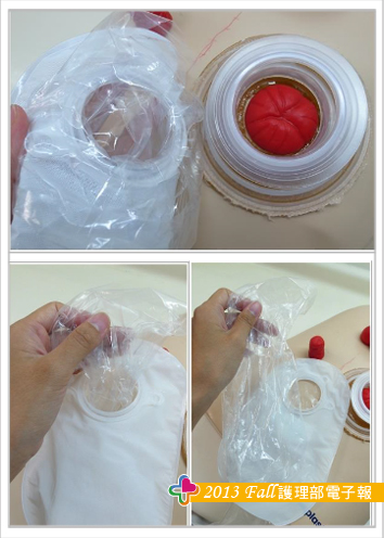 將套好塑膠袋的造口外袋,塑膠袋口外翻保留在外,即可接合於墊高環使用。扣合外袋時,可以兩指上下緊壓外層壓條,容易施力且不會造成患者不適。