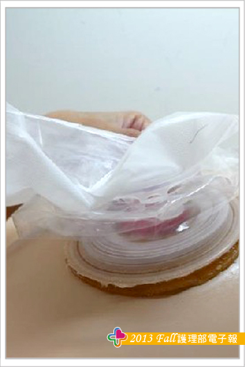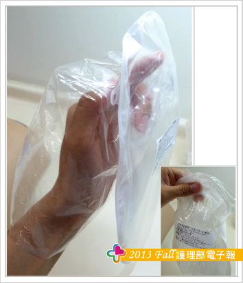 以套垃圾袋的發展概念,將造口外袋視為垃圾桶,小塑膠袋由內側套入造口外袋。