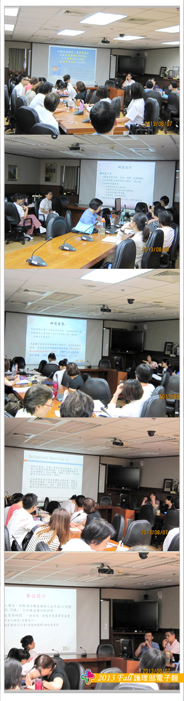 一週後,該來的終究是來了,第三階段也是整個進階實證護理課程中,所有種子教師和學員最後一次正式聚會討論的時間,但這並不是結束喔!只是爾後各組間能在一同相聚討論、琢磨的機會少了,要告各組各自努力了。有了前次報告的經驗後,最後一階段的進度報告改善許多,在進度報告前,各組仍如戰前戒備,學員們小心翼翼地研擬計畫,模擬任何一項可能被提問、有爭議、模糊或交代不清的問題點,不斷的反覆討論、研擬、修改、排演。報告過程,各組也充分的利用15分鐘的進度報告時間,紛紛主動提出執行現況和困境,不管是對研究收案對象、地點、介入措施方式、IRB審查…等各式各樣的「問題」都出來啦,試圖網羅更多種子教師和學員的不同的見解、想法、對策和觀念認知的澄清,經由相互提問、討論、解惑,彼此的凝聚力、共識、信心也大大提升。學員們此起彼落熱情的回饋與提問,看著大家討論著、分享著每個研究案未來進行的方向,那和諧、求知的渴望、意猶未盡的場景,但終究在時間的追趕下畫下了句點。