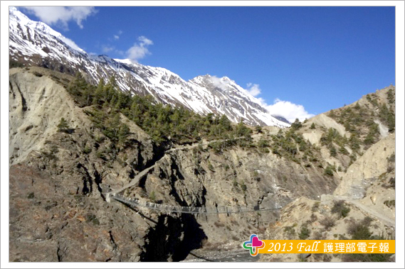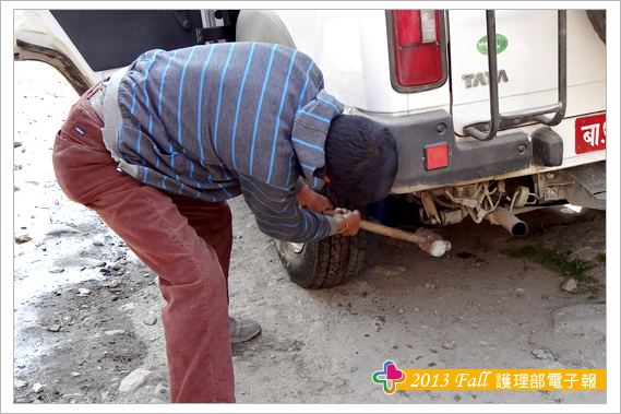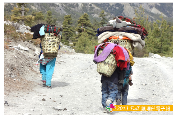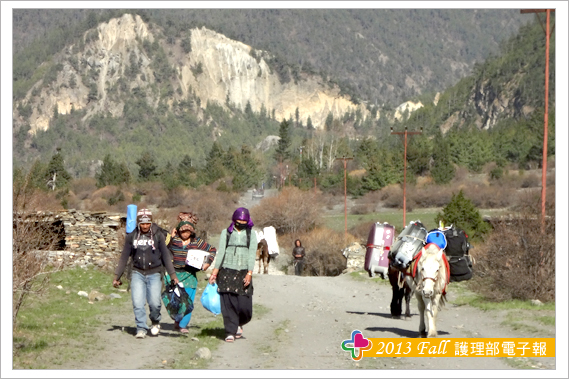 出團前根本來不及體力訓練,不過聽說”有馬騎”,心想走不動就騎馬吧!沒想到事情完全不是像城市佬想的這麼美好!光是從加德滿都坐車到Manang山區周邊的村莊,就從天亮坐到天黑。首都加德滿都的路大多是沒鋪柏油的,更別說是山路了,簡直就是四驅越野賽車,但一路上司機展現超高技術,讓我們十分佩服。同行的喇嘛輕描淡寫地說:前方「路況不好」,夜間行車危險,司機建議我們停留過夜。隔天一早我們看到路邊的「大瀑布」,才知道什麼叫做「路況不好」。我們開車到車子能到的最遠的村莊─Chame(海拔2,650 公尺),才知道馬是用來「駝行李」的,不是「給人騎」的,所以往後的幾天,大夥兒必須「步行」巡迴醫療。