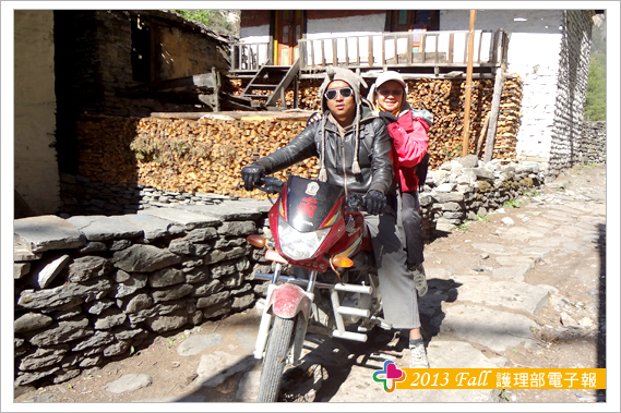 隔日除了執行長堅持走完全程外,我們三人決定感受搭乘越野摩托車翻山越嶺的「快感」,果真我們上山時走了一整天的路程,竟然騎車不到兩個鐘頭就到Chame了。隔日又坐上了13個鐘頭的”碰碰車”,回到加德滿都。躺在舒服的床上,真有種現實與夢境交錯的混亂,在山上恨不得趕快回家,一下山又懷念起山上的一切…。