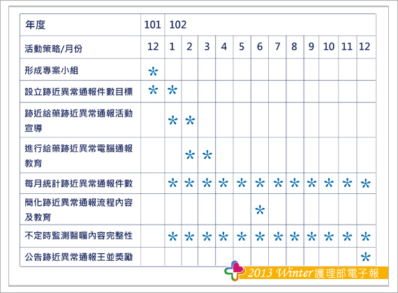 護理品管圈於每月品管及病房會議中,將跡近異常通報事件件數列入議程,並於會議上,除口頭獎勵通報同仁名單外,也將跡近異常通報一系列活動作一宣導,並將通報列入績效考核及實質獎勵,以鼓勵人員做通報,並強化人員執行意願。除了會議宣導及教育訓練外,也培訓單位臨床教師為跡近異常通報種子,將觸角伸入新進人員學習歷程中,運用臨床教師協助指導,以強化新進人員對跡近異常通報文化之深耕及重視給藥安全。