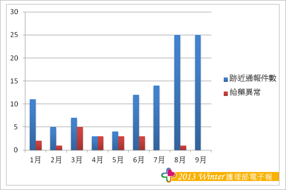 在執行給藥跡近異常通報改善專案活動中,專案小組成員發現2013年4、5月跡近通報件數下降,而給藥異常卻未見能改善!於是,專案小組成員暗中無預期監測,發現人員常因接新病人忙碌、醫囑核對不確實及人員反應跡近異常通報系統繁瑣、耗時,而影響醫囑核對及通報意願。故專案小組與單位主管討論後,予以改善並簡化異常通報內容,並重新宣導及教育單位人員確實核對醫囑重要性,其中在人員忙碌或迎接新病人時,當班主管則重新調配人力予以協助及查核醫囑完整性,以確保醫囑完整性核對及執行。
