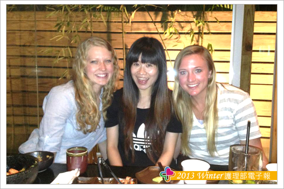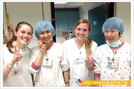 相處的這一段時間,除了讓他們瞭解臺灣醫療護理文化之外,我也嘗試瞭解他們西方照護模式,雖然他們只是大學生,也在醫院實習經驗並不久,但仍可知道西方醫療護理與我們相異之處,例如:我們的抗生素幾乎都是粉劑,需計算劑量然後稀釋抽藥,而他們的藥幾乎都是已經稀釋完畢,所以不需花多餘的時間在抽藥上,其實我認為這是非常有效率的;另外,她們可以自行評估病人是否需會診其他科別,然後自行開立會診單;其次,他們認為我們花了很多時間在抽藥、幫病人執行身體清潔或口腔護理等,因為在她們所實習的醫院裡,會有像是護佐的人員協助執行醫療以外的照護。