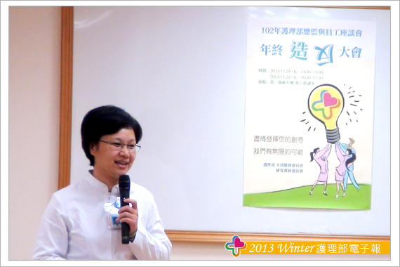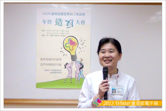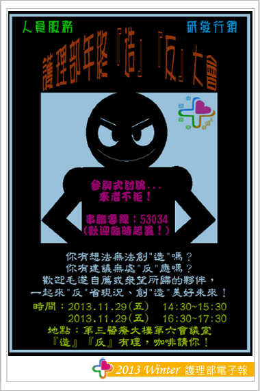 歲末年初之際又是回顧今年、期盼明年的開始。護理部一直以來積極打造雙向溝通平台,除了重視臨床第一線人員的工作環境、職涯發展、人人亦可透過雙向溝通來表達建議,如:主管會談、提案單、員工座談會等。當然,今年的盛事-「員工座談會」,也透過護理部人服和研發委員會悄悄地籌辦中。其中文宣海報斗大的標語極為驚艷-護理部年終「造」「反」大會 (圖一) 是此座談會展號召力的開始,同時為充分的讓臨床護理人員不因上班而無法參與,因此特別精心籌劃二場座談會。