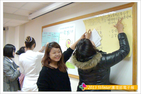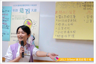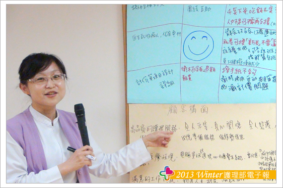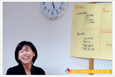 接著以「平衡計分卡概念」檢視過去、展望未來,分別依「顧客構面」、「財務構面」、「學習構面」、「內部流程」四大構面,引導同仁對部內這一年來各項推行、改變等業務提出個人想法和建議。每位同仁均可從這四大構面中,挑選出一個感興趣的構面,憑藉個人感受將自己覺得「驕傲」、「滿意」、「需再加強」的三部份逐一寫出。最後採分組方式,以同一構面的人為一組,分4組。每個人將手中所寫下的想法與小組成員討論,透過意見溝通、分享 、妥協、說服等等方式交流後,統整成一份,最後由每個構面的小組推派代表,向大家說明構面中同仁覺得「驕傲」、「滿意」、「需再加強」的部份。報告的過程中,同仁對部內護理資訊、用藥安全提示、實證護理、進階制度、全人照顧、針扎安全等等均給予高度的肯定。當然!好還要更好,同仁在過程中也回饋諸多建議與想法。