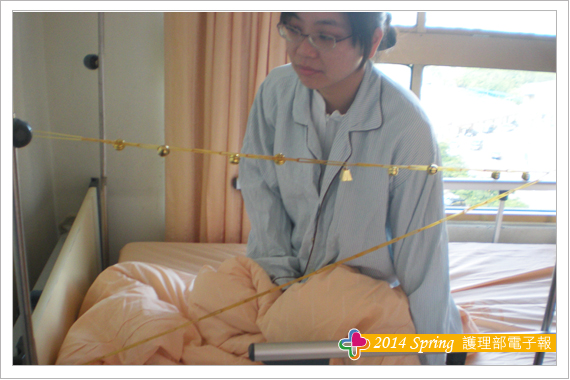3.鈴鐺繩掛於床上點滴架之調整高度處,符合成人病人坐起高度,病人坐起要從床尾下
