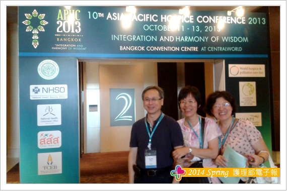 此次亞太安寧國際會議(APHC)在泰國曼谷展開,今年共有21個國家、905名全球安寧療護專業人員參與盛會。台灣代表團約100人參加,在大會發表87篇海報、論文;更為2年後(2015)所爭取到的APHC主辦國再做一次宣傳。