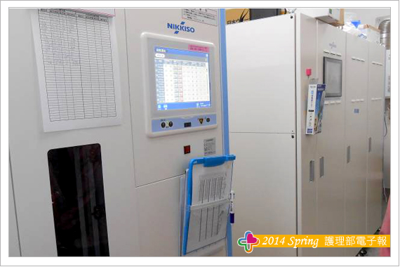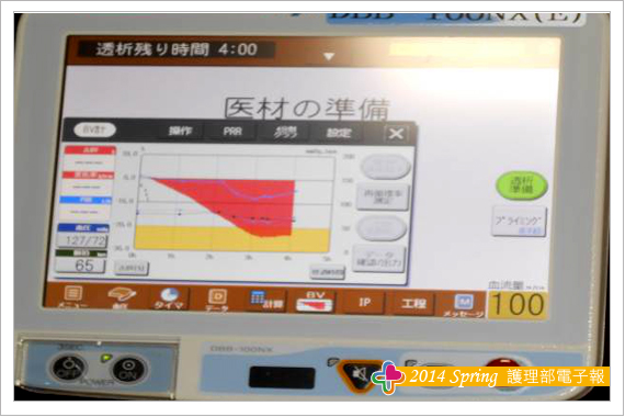 首先有電腦控制系統的透析液系統,將當天所需之藥水總量計數、擺入;機器會自己更換,當病人到達,待機時自動輸送透析液至該病人透析機;病人進入診所內取晶片卡插入,磅體重自動寫入透析機內,只要將病人進食、補充之生理食鹽水及回收之生理食鹽水輸入,即可自動計算並設定脫水量。另一方面,只要將迴路銜接人工腎臟並架在透析機上即自動沖洗;同時透析機亦自動依醫囑執行各項設定,過程中血壓監測亦自動控制,護理人員只需執行瘻管穿刺後銜接動、靜脈迴路管即可,處理透析中病人問題維護病人透析過程安全至結束透析,真正提高效率,才能落實護理照護的獨特功能。而對於病人瘻管的照護更是讓我欣羨不已,當病人出現血管問題,不論透析前、中、後,陣內彥博院長馬上進行經皮血管成型術(PTA)處理血管問題後方可繼續透析,不僅照護病人的第二生命線,維護透析品質,既可達到病人就醫可近性、便利性、即時性更確保病人安全。這些都是未來我們努力的方向。