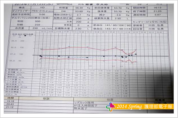 反觀院內的透析治療團隊,依循醫院宗旨「關懷、專業、效率」、秉持以「病人為中心」的照護理念,目前臨床實務也藉由資訊化,提升醫護人員工作效率,讓人員更有時間照護病人、傾聽病人、同理病人,運用我們的專業協助病人,促進身、心、靈、社會的全人健康。本單位自2011年12月於本院區設立,即與永康奇美無縫接軌,不論設備、專業素質、人文素養、服務態度深獲病人肯定與讚賞,重點在於工作團隊的群策群力、認真踏實追求照護品質,同時也獲得院方及護理部的支持,展現照護品質贏得地區民眾的信任,服務量亦蒸蒸日上。此外,2013年10月台腎訪查更讓評審委員對於本院透析紀錄資訊化嘖嘖稱奇,但我們不能因此而自滿,未來我們也會學習日本一貫化、自動化的精神,運用創新護理、精簡流程讓護理人員更有效率的照護透析病人、維護透析病人及家屬的健康。