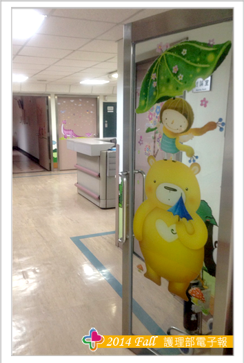 圖一、病童報到的「溫馨之門」 以溫馨的壁貼打造「溫馨之門」,營造愉悅的氛圍,開啟探索環境的心,藉以轉移焦慮害怕的情緒。 |
