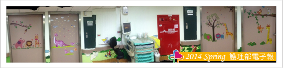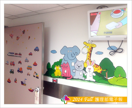 圖五、治療室的壁貼 營造繽紛的環境及多元的圖騰,除有聲原刺激的卡通頻道外,亦有多種的壁貼圖案,以利注射過程有更多轉移注意力的選擇。 |