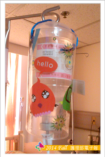 圖七、點滴瓶的外套 以透明的軟墊板設計多款貼有卡通圖騰的點滴瓶外套,並於更換點滴時提供「外套」予病童選擇,增進病童對治療的參與及控制感;且符合感染控制原則,以75%酒精噴拭後閒置晾乾,即可反覆使用。 |
