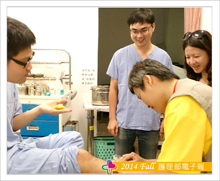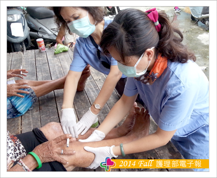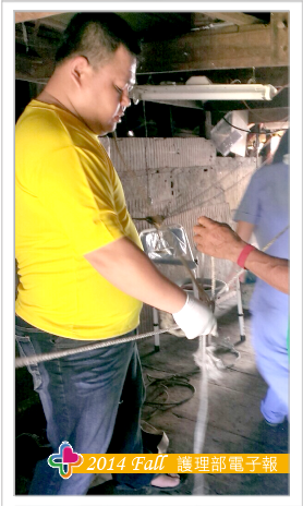 次日早上,也依擬定的短期目標進行訪視員和志工的在職教育。今天的個案一,由怡君護理師示範食物與快凝寶調配下,適合病人由口進食濃稠度,及教導簡易患肢復健;個案二則是癌末安寧居家照護。最後就是今日的重頭戲啦!協助疥瘡個案全面大清潔,同時衛教案家疥瘡防護事項。任何的照護前,做好防護措施是很重要的!儘管蘭嶼的太陽熱到會咬人,在悶熱到令人窒息的房間裡,我們還是穿著自備的隔離衣(拋棄式雨衣),帶著口罩和手套開始大清潔。雖然斗大的汗珠一直流下,但在大家攜手分工協助個案完成身體清潔,包括:洗澡、除毛、刮鬍子、換胃管、氣切護理、擦藥等,那份一致的目標與信念,已經讓我們遺忘雨衣下那早已浸濕的衣褲啦!