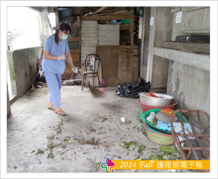 首站探訪的個案是臥床已久的阿公,我們教導案家如何協助個案拍痰、翻身、身體清潔,及針對食慾差的部份提供簡易的飲食參考。個案二主要是居家關懷與探視,跟著訪視員追蹤已收案的個案了解現階段問題,並提供心理支持。個案三,為協助獨居個案進行居家環境清潔。
