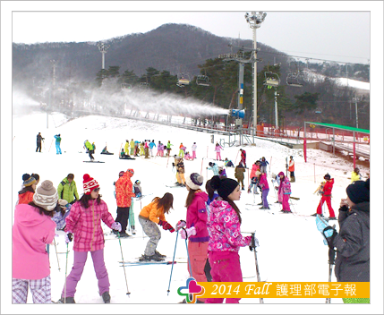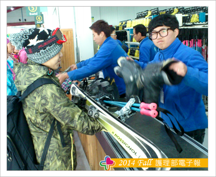 我們的行程很緊湊也很滿,讓你一刻不得閒,直接切入重點:行前朋友已幫我們報名了滑雪一日遊,所以當天很早天未亮我們就坐捷運到當地的旅行團報到,集合之後坐上遊覽車多是台灣人及陸客朋友,一路浩浩蕩蕩前往滑雪場。首先,帶我們到滑雪裝備區挑選自己的雪衣及手套護目鏡等,哇塞!各種花色都有琳瑯滿目,看了真開心我要挑一套閃亮亮獨特的滑雪衣,此外保暖也很重要,一副保暖實用的手套及保暖的襪子毛帽也很重要,誰教我在台灣沒準備齊全,到了「寒國」也得花下去。