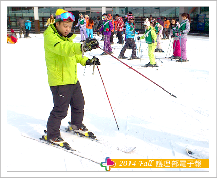 裝備選好後,到了滑雪場就要選擇雪鞋及雪仗,雪鞋不是一般人所想的這麼簡單,它又笨重又難穿脫更難於行,好不容易穿上它,走在雪地上搖搖晃晃又濕滑真是考驗我。一開始會有教練先教你暖身運動,再來就是基本的站起及倒下的動作,千萬別小看這兩個簡單的動作,穿著雪鞋,讓我這運動白癡覺得連蹲下跟站起都好吃力,要用你強韌的小蠻腰支撐你站起的力量,學會之後再教你小波滑行。以側身慢慢跨步往上前進,到了定點後教我緩緩滑下,其實我內心很害怕,很怕摔了個狗吃屎就難看了,而且雪像是抹上潤滑油一樣地滑,不知哪來的勇氣,傾身向前重心放低急速向下,瞬間感到好爽快,但說時遲那時快我還不知如何煞車時已經到地面了,還好下面有教練拉住我不就演出翻觔斗的大戲了。