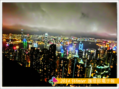 稱香港為多元文化的社會實不為過,參與護理研究會議的人來自世界各地,有美國、日本、菲律賓等,我站在寧靜的角落拉長耳朵聽,儘管語言不同,卻同樣為著護理的進步而努力,心中悸動莫名,姑且不論與會內容,海島形的氣候加上熙來攘往的人群,使香港的空氣顯得潮濕且悶熱,讓人心曠神怡的太平山夜景此時便更顯記憶猶新。這個時候絕對要配上慢動作與柔焦的畫面處理,肯定能勾勒出少女情竇初開的心境。拜臨立的高樓大廈及日新月異的科技所賜,一到夜晚,黯淡的建築物在七彩燈光的渲染下顯得絢爛炫目,就像文藝復興時期波希的畫風,畫筆輕輕一撇,世界就變的色彩鮮明,但當夜晚過去,我卻希望盡收眼底的是現在腳踩的綠意盎然的太平山。