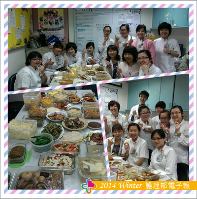 活動當天早晨,同仁的神情皆是充滿笑容,不一會功夫討論室的冰箱已放滿了大家帶來的餐盒,每個人嘴上都笑著說期待中午的午餐,感覺單位氛圍充滿快樂因子,接近中午十一點由護佐協助微波及擺盤午餐,大家不約而同輪流進討論室關心午餐進度,也都迫不及待參觀菜色,頓時之間大家雀躍、愉快心情都被提升到頂點,當日工作效率特別好,就在白班人員輪流共進午餐的同時,神經內外科的醫療團隊看見如此豐盛的菜色;也對同仁手藝稱讚不已,藉由一道道的菜色,開啓了話題,頓時之間低頭滑手機的景象沒了,此時看見的是「人與人之間」情感正在流動,透過讚美與分享,我們得到的是正向能量的氛圍,也共創了大家美好的記憶,低頭滑手機景象沒了,然不免俗的拍照po社群網站,分享我們精彩菜色,屆時即開始動起筷子,美食當前每個人開心的品嘗佳餚,有自己的拿手菜也有來自媽媽的愛心!又大家準備的菜色豐富及份量足夠,使得夜班人員也能分享「愛宴」,又從Face book看見午餐的菜色,來上班的第一個動作就是趕緊開冰箱,期待豐盛的「菜尾」,夜班也受惠「愛宴」活動開心不已,對大家而言這樣的活動可以在忙碌的工作環境注入一股暖流,「吃在嘴裡,甜在心裡」感覺,達到CI Care 表達的意境,所以我們會一直辦下去,這是「第一屆6A愛宴活動」。