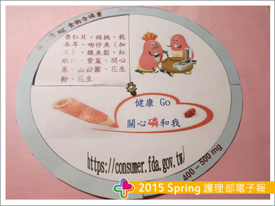 我們以衛生署公布的食品營養成分表作基礎,在營養師協助諮詢下,研擬推出為腎友設計之「高磷食物衛教轉盤┘,將每100公克食物含磷量區分成八大格,並以簡潔易懂及色彩鮮明為製作方針(顏色愈深代表含磷量愈高),提供簡單化、生活化、易攜帶的衛教轉盤,讓腎友易於辨識食物的含磷量;高血磷衛教影片經由同仁巧妙編劇,以動畫方式呈現,偕同醫師及護理人員共同錄音,影片主要傳達控制血磷的重要性及磷結合劑正確的使用方式,讓不識字或年長的腎友,都可以藉由影片及圖片的識別達到控制飲食的目的。年節將近,透析病人易因暴飲暴食導致年後抽血報告滿江紅,單位主管特為重視此問題,故設計年節飲食海報,希望透析病人在歡度節慶的同時,也能維持良好的透析品質。