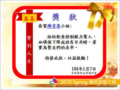 「秋萍,我這個月磷只剩5.8,都是那個衛教轉盤的功勞。」,她每次和我分享每月血磷值時,總是帶給我無比的驚奇與鼓舞。歷經此次的衛教經驗讓我有所省思,口頭衛教指導是指引病人正確觀念的明燈,衛教輔具是當病人迷路時所必備的地圖,在兩者雙併善用下,衛教的效益不容小覷。以此病人衛教成效為方針,特製獎狀以茲鼓勵;竭誠地希望腎友們在感受到醫護團隊的用心後,能於隨餐慎選低磷食物食用,共同迎向「腎」利人生。