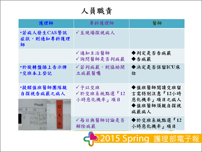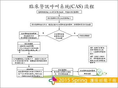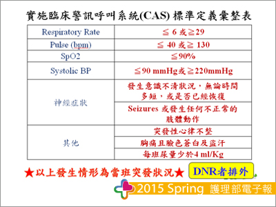 5B胸腔科病房病人多為老年人加上疾病因素,往年呼叫急救小組的次數,無人能出其右,所以成為改善的目標單位。經參考他院的經驗、文獻與院內原訂定的「臨床人員交班守則」,在品管中心、急診與加護醫學部的主任、胸腔科主治醫師、科督導、護理長共同討論後,建立臨床警訊呼叫系統(Clinical Alert System, CAS)的定義(圖一),以正確與迅速地提示第一線醫護人員通報功能,提醒醫療團隊提前預防與處置,如:提早轉入加護病房觀察、事先簽署不施行心肺復甦術救同意書(DNR)、或提早準備急救時可能發生的措施,臨床警訊呼叫系統內容共六大項,包括:呼吸(≦6次/分或≧26次/分9)、心搏(≦406次/分或≧1306次/分)、血氧濃度(≦90%)、收縮壓(≦90mmHg或≧220mmHg)、神經症狀(發生意識不清、無論時間多短,或是否已恢復)、其他(突發性心律不整、胸痛且臉色瘡白及盜汗、每班尿量少於4ml/kg)。若病人已簽署DNR者除外,發生定義項目中任何一項變化,則啟動CAS的機制(圖二、圖三),會中亦抵定各職類人員的職責(圖四) ,為能讓人員了解改善的目的與重要性及CAS的定義,科督導於病房會議說明,102年先由5B病房試行。