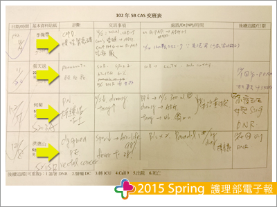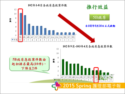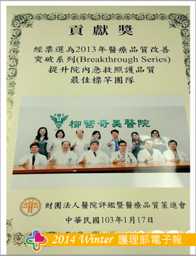 推行品質突破活動-提升急救照護品質過程,感受到大家為達到目標而各自卯足全力全心投入,透過危急病人臨床警示系統,提高對高危險群病人警覺性,且經由醫療團隊的努力與合作,確實得到良好的成果,降低5B病房不預期心跳停止事件,且不負重望於2014年1月經醫策會選為「提升急救照護品質最佳標竿團隊」,著實給予5B病房在提升臨床急救照護品質的肯定,過程雖辛苦,但也讓我們受益良多。103年CAS已公告全院實施,5B病房與內科2名護理長、專科護理師組長組成成組心肺復甦急救示範小組共演練2場,獲同仁的好評,由衷感謝團隊的不吝嗇的指導與協助,還有單位同仁、專科護理師們團結不懈的精神,期望藉此能持續提升急救照護品質。