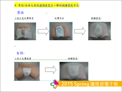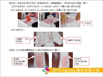護師能有所依循、瞭解其重要性,以強化落實執行。內容除簡介失禁性皮膚炎與預防的重要、三大照護策略外,亦加入「DIY做紙尿布/尿布之回滲、滲漏測試方式」(圖一)與「男性/女性之尿液浸潤者尿片+彈性網褲固定方式」(圖二)。為順利推廣,將其存檔於每台行動護理車,以便利人員隨時使用。