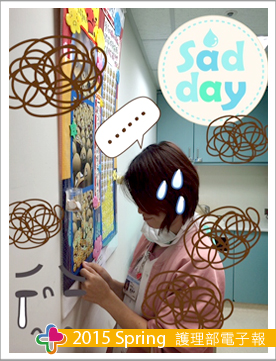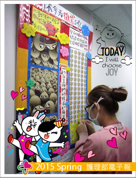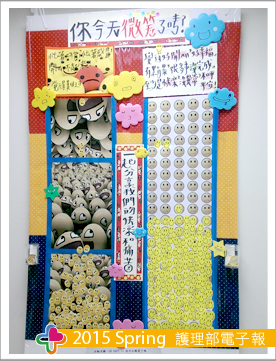 於是,我從人際互動中最基本的「禮貌」開始推起,首先,倡導禮貌四部曲,做為單位之家教,分別是道安:上班時問好請安;道謝:合作時不吝言謝;道歉:失誤時勇敢致歉;道別:下班時互道離別。接著,進入活動執行期間,單位全員動起來,歷經一個月的統計,不論是正面情緒,如::愉悅、溫馨、開心、快樂、幸福、沒有異常、同事相處融洽等,或是負面情緒,如:感冒發燒、沒時間休息、生病不舒服、作業很多、異常頻繁等,都是同仁最真實的心情寫照,當不開心指數達到每一個預設之關卡時,將會有不同的驚喜呈現出來,當啟動破關警示,救火特攻隊(執行小組)便會執行滅火行動(紓壓措施)。雖然院內活動已告一段落,但我們仍會繼續推行下去,所以不管未來的路會歷經多少壓力與挫折,我們都會是最棒的,因為我們學會以「微笑」面對挑戰。
