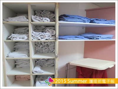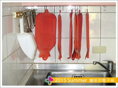 在工作環境中,我採用了右腦創意圖像化來規劃管理,圖像可讓人更加深印象,於準備室牆面貼置標語、更衣室製服櫃增設層板(圖二)、牆面釘置掛勾收納護理人員名牌及臨床作業上使用之警語告示牌、被服室與儲藏室之物品定位擺放整齊(圖三)、配繕室冰枕使用窗簾掛勾吊置(圖四),使冰枕內殘留的水,注入水槽內,可降低地板潮溼率有效預防病人跌倒造成傷害,建置病人安全的醫療環境,於住院病患姓名旋轉牌上方製作(電擊器、烤灯、輪椅、冰箱冷藏藥物)標籤,放置於使用病人床號上方,提醒辦理出院人員,將病人冰箱冷藏藥物帶回,有效降低健保成本。