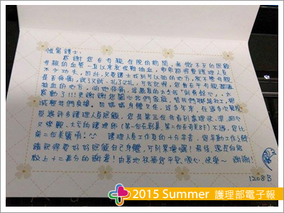 回家看了卡片後更是明白,「護理師」不單單是病人生病過程中的「過客」,而是能留在病人、家屬心中深刻的痕跡;這更讓我省思了,原來在我的工作中,不管是病人對我,亦或是我對病人,哪怕只是一句話、一個動作、一個安慰,都是會觸動人心的!