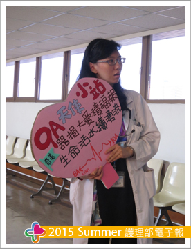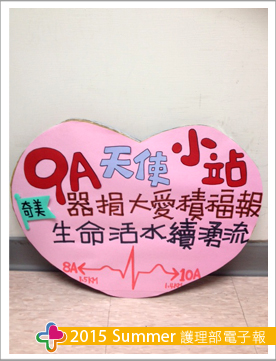 經過集思廣益,訂下活動標語:「器捐大愛積福報,生命活水續湧流」,表達器官捐贈不但可以讓生命延續,還可以替自己積福報,造福更多人的生命得以延續,使更多家庭重拾幸福,就如同火車到站的方式呈現,一站接一站,永不停歇。我們也結合了團隊共同參與,感謝一般內科王淑慎醫師也抽空共同參與活動,團隊的加入,讓活動更多采多姿。