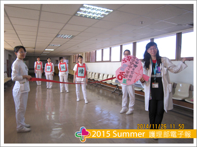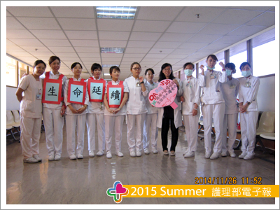 活動中,我們穿著標有「生命延續的接力賽」背心,以小跑步的方式一棒接一棒,最後抵達終點,看著大家整齊劃一的念著我們的標語,聲音迴盪在9樓空橋,是一種生命的震動,其震撼力令人為之動容,原來我們做得到,也做得很棒。