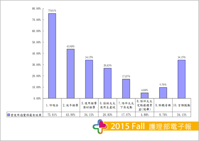 陪伴太太待產及生產過程中,曾經使用過並覺得最有效果的技巧有呼吸法佔75.61%、徒手按摩43.90%、使用按摩器材34.15%、言語鼓勵34.15%、協助太太使用生產球 26.83%、陪伴太太下床活動17.07%、聆聽音樂9.76%、陪伴太太搖擺骨盆(慢舞)4.88%、 未曾使用過且覺得最沒效果的技巧為熱敷及冷敷。