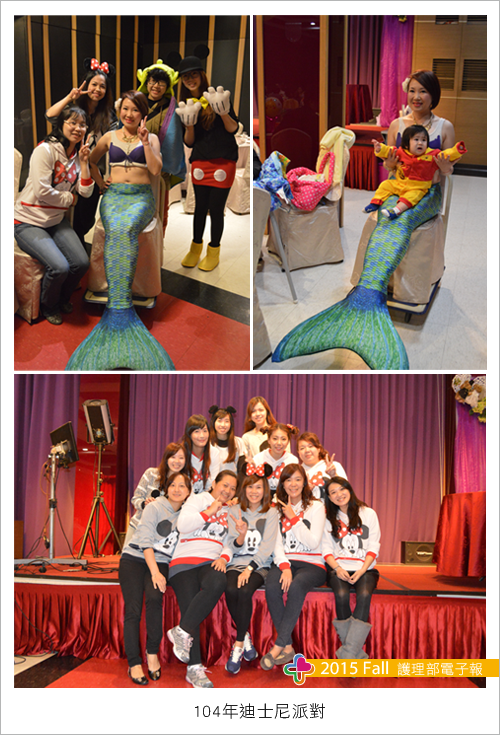 又是季末年初的尾牙時節,你正在練「小蘋果」或金燕姐姐的舞曲嗎?每到這個時候,常常會聽到這樣的問話:「你們單位今年要表演什麼?」、 「今年要走什麼風格?」。這個時候,對於身為行政組一員,無疑是腦細胞大考驗,各種表演活動的設計、餐會地點及遊戲的籌劃,一再考驗我們的創意及動員能力。不知何時開始,每年單位都會有一主題派對,從睡衣趴、童話風、青春校園制服到迪士尼派對,這妝扮是連參與來賓都要等同辦理,記得去年的學生制服風,來賓4A病房的富美護理長很有心穿了學士服出席,還獲得造型獎第三名,而今年,單位人員有種越玩越大的趨勢,大手筆的出現一條美人魚,創下了活動最高潮。而這隻美人魚還從單位忘年會游到了兒科忘年會,當然其精緻度更是晉級不少。