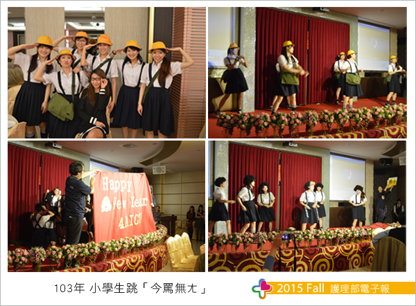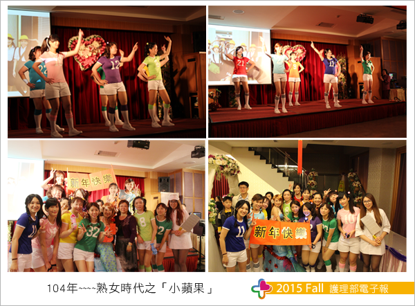 而每年兒科忘年會的表演節目,更是讓行政組員極度頭痛的一件事,這個時候單位同仁幾乎都變身為幼幼台的水果姐姐,載歌載舞的練習當年度夯歌,從去年穿著小學生服跳著「今嘛無ㄤ」,到今年穿著少女時代服裝跳著「小蘋果」,被戲稱為「熟女時代」的我們,一把老骨頭練下來,貼布幾乎是成打的消耗。尤其跟年輕學妹一起練習的時候,更覺得自己青春不再,不只體力上,記憶力更是落後一大截。明明上一秒還記得的舞步,等音樂一下又走鐘了。現在回想起來,還是心有餘悸,真的是台上十分鐘,台下十年功。