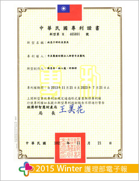 本創新案運用約束替代方案「拳擊手套胖胖瓶」於臨床病人,除減少約束相關併發症及壓瘡發生率、提高病人自主權及提升病人、家屬服務滿意度外,更創造優質的護理品質。於2013年5月進行專利申請,且於同年11月獲中華民國新型專利認證(M465891)(圖二)。創新活力是一個組織不斷往前推進的動力,更是獲得優勢的關鍵,整體而言新型約束器具不僅對病人有利,更對忙碌的臨床護理人員頗有助益,期盼透過此約束方式,減少病人因約束導致不適感。